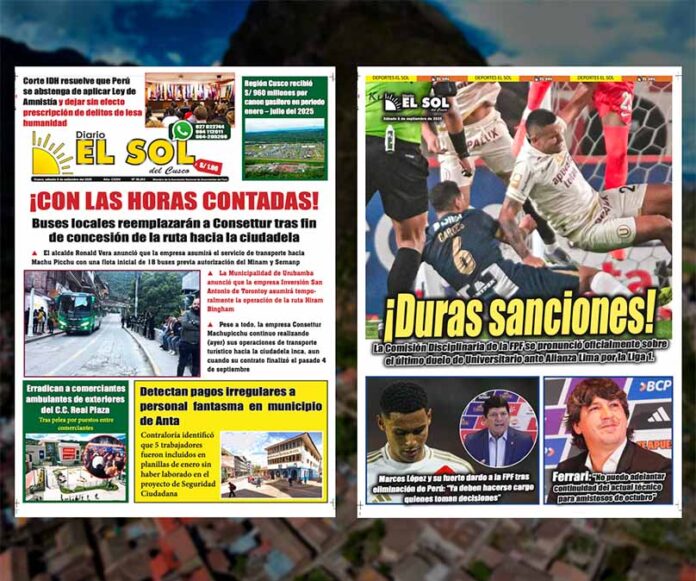 HomeEdición impresaSábado 06 de setiembre del 2025 Edición impresa Sábado 06 de setiembre del 2025 6 septiembre, 2025 Share FacebookTwitterWhatsApp Share FacebookTwitterWhatsApp Previous article🔴 José Luis Pérez Guadalupe, Maritza Quispe y Gary Marroquín en No Hay Derecho [04-09-2025]Next articleAVISOS DEL 06 DE SETIEMBRE DEL 2025 MÁS ARTÍCULOS Locales Fiscalía de Violencia contra la Mujer de Echarate, consigue cadena perpetua por violación de menor 4 octubre, 2025 Locales Mercedes Aráoz: “Machu Picchu no es patrimonio del Cusco, es del Perú” 4 octubre, 2025 Locales Visitas a Machu Picchu muestran una «recuperación rápida» y boletos para octubre y noviembre se agotaron 4 octubre, 2025 Most Popular Los Chankas vs Cusco FC por la fecha 13 del Torneo Clausura de la Liga 1 2025 4 octubre, 2025 Con el Universitario vs. Juan Pablo II: la programación de la fecha 13 del Torneo Clausura 4 octubre, 2025 Fossati: «Debemos mantener el equilibrio emocional y la humildad» 4 octubre, 2025 Luces de la ciudad del 04 octubre del 2025 4 octubre, 2025 Load more