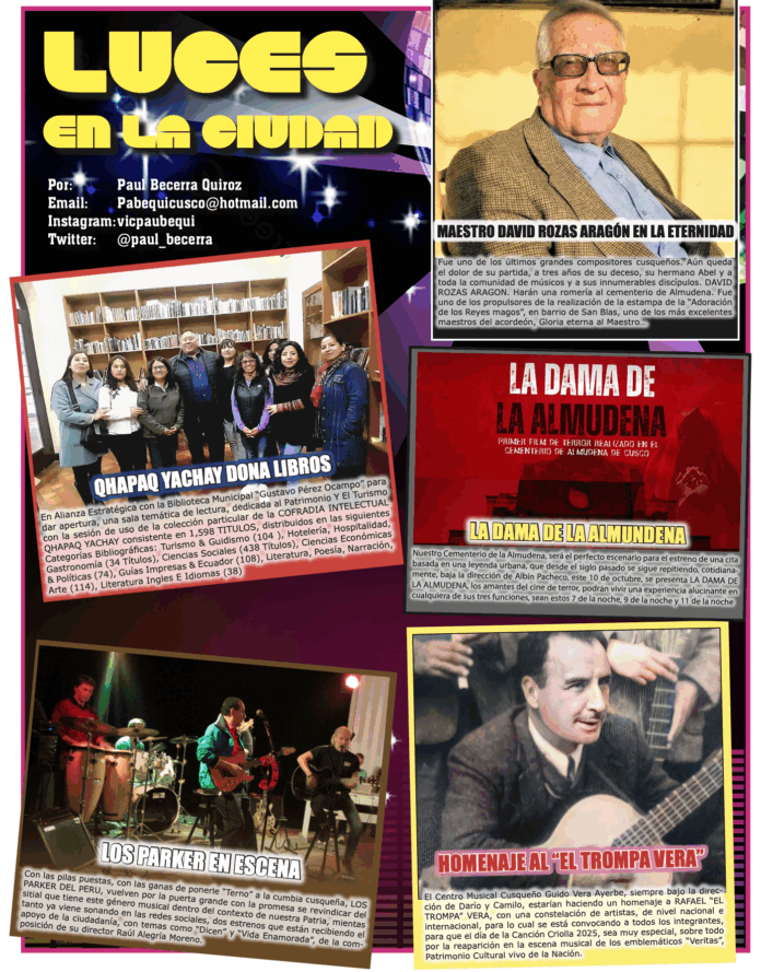 HomeLocalesLuces de la ciudad del 04 octubre del 2025 Locales Luces de la ciudad del 04 octubre del 2025 4 octubre, 2025 Share FacebookTwitterWhatsApp Share FacebookTwitterWhatsApp Previous articleAbogado de Martín Vizcarra confirmó que irán a la CIDH para revertir inhabilitaciones: «Estamos planteando que el Perú está en crisis democrática»Next articleFossati: «Debemos mantener el equilibrio emocional y la humildad» MÁS ARTÍCULOS Locales Fiscalía de Violencia contra la Mujer de Echarate, consigue cadena perpetua por violación de menor 4 octubre, 2025 Locales Mercedes Aráoz: “Machu Picchu no es patrimonio del Cusco, es del Perú” 4 octubre, 2025 Locales Visitas a Machu Picchu muestran una «recuperación rápida» y boletos para octubre y noviembre se agotaron 4 octubre, 2025 Most Popular Los Chankas vs Cusco FC por la fecha 13 del Torneo Clausura de la Liga 1 2025 4 octubre, 2025 Con el Universitario vs. Juan Pablo II: la programación de la fecha 13 del Torneo Clausura 4 octubre, 2025 Fossati: «Debemos mantener el equilibrio emocional y la humildad» 4 octubre, 2025 Abogado de Martín Vizcarra confirmó que irán a la CIDH para revertir inhabilitaciones: «Estamos planteando que el Perú está en crisis democrática» 4 octubre, 2025 Load more