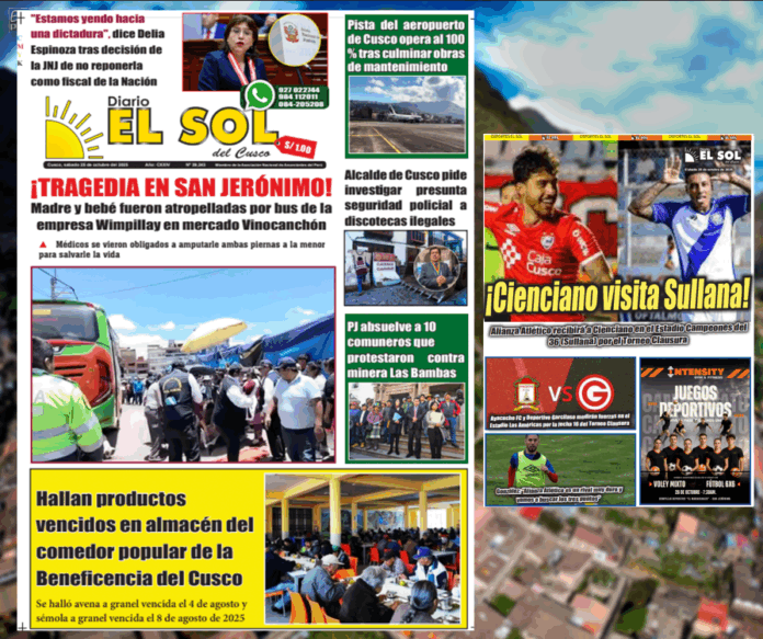 HomeEdición impresasábado 25 octubre 2025 Edición impresa sábado 25 octubre 2025 25 octubre, 2025 Share FacebookTwitterWhatsApp DiarioElSolCusco.pe 25 octubre 2025 TagsDiario El Sol Cusco Share FacebookTwitterWhatsApp Previous articleAhora es «HÉROE» el policia que m4t0 a Truco #LaEncerrona MÁS ARTÍCULOS Locales Rescata a cuatro jóvenes que se desorientaron en cerro Picol 14 octubre, 2025 Locales Suspenden vuelos hoy y mañana martes 14, por mantenimiento de aeropuerto cusqueño 13 octubre, 2025 Nacionales Dina Boluarte dice que «no está en su más mínimo pensamiento» dejar el país tras ser vacada por el Congreso 11 octubre, 2025 Most Popular Ahora es «HÉROE» el policia que m4t0 a Truco #LaEncerrona 24 octubre, 2025 🚨 DELIA ESPINOZA:»SE VIENE UN GOLPE DE ESTADO» #salvesequienpueda 24 octubre, 2025 Clínicas ocupacionales con certificación de salud Laboral en Todo Lima 23 octubre, 2025 Servicios Médicos Ocupacionales en Lima Metropolitana 23 octubre, 2025 Load more