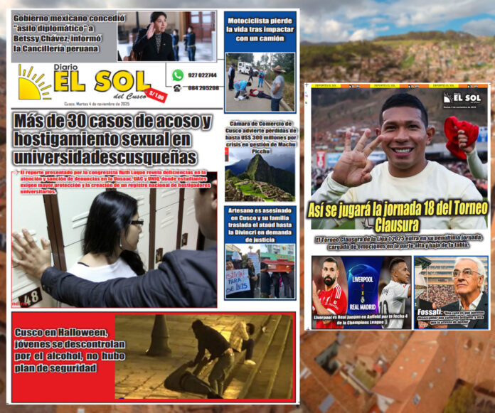 HomeEdición impresa04 noviembre 2025 Edición impresaSin categoría 04 noviembre 2025 4 noviembre, 2025 Share FacebookTwitterWhatsApp DiarioElSolCusco.pe / Edición impresa Martes 4 noviembre 2025 Tags04 noviembre 2025diarioelsolcusco.peedicion impresa Share FacebookTwitterWhatsApp Previous articleEntregan semillas de avena forrajera a productores de 19 comunidades en EspinarNext articleLluvias intensas podrían generar huaycos, derrumbes y deslizamientos en Calca, Paucartambo y La Convención MÁS ARTÍCULOS Internacionales Al menos siete muertos en accidente de avión de carga en Estados Unidos 6 noviembre, 2025 Locales SUTEP Cusco anuncia paro nacional de 24 horas para el 13 de noviembre 6 noviembre, 2025 Locales Obreros sindicalizados denuncian mafias laborales en el gremio de construcción civil 6 noviembre, 2025 Most Popular Natalia Málaga vuelve a la Liga Peruana de Vóley para dirigir al club Regatas Lima 6 noviembre, 2025 Alianza Lima se impuso 2-1 a Los Chankas en Andahuaylas y aseguró su clasificación internacional 6 noviembre, 2025 Partidazo en Champions: Brujas igualó 3-3 ante Barcelona en un duelo de infarto 6 noviembre, 2025 Cusco, Jueves 6 de noviembre de 2025 6 noviembre, 2025 Load more