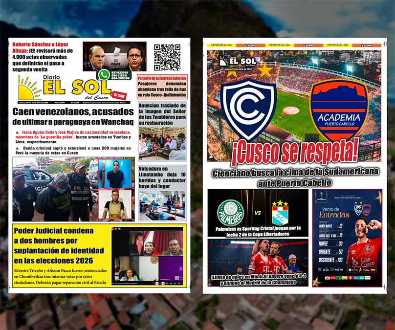 HomeEdición impresa16 de abril del 2026 Edición impresa 16 de abril del 2026 16 abril, 2026 Share FacebookTwitterWhatsApp edición del 16 de abril 2026_compressed Share FacebookTwitterWhatsApp Previous articlePerú Femenino en zona de repechaje al Mundial tras empate ante ParaguayNext articleTurismo en feriados de Semana Santa generó impacto económico de US$ 228.5 millones MÁS ARTÍCULOS Locales MTC garantiza el mantenimiento de la vía de evitamiento en Ollantaytambo 16 abril, 2026 Locales Pasajeros denuncian abandono tras falla de bus en ruta Cusco-Quillabamba 16 abril, 2026 Locales Deslizamiento deja al descubierto muro con posibles rasgos prehispánicos cerca del sitio arqueológico de Sillkinchani 16 abril, 2026 Most Popular Cienciano vs Academia Puerto Cabello juegan por la fecha 2 de la Copa Sudamericana 2026 16 abril, 2026 Palmeiras vs Sporting Cristal juegan por la fecha 2 de la Copa Libertadores 16 abril, 2026 ¡Lluvia de goles en Múnich! 16 abril, 2026 Servicio personales 16 abril del 2026 16 abril, 2026 Load more